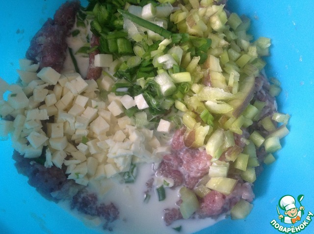 Влить в фарш сливки и добавить нашинкованный зеленый лук. Сулугуни режем маленькими кубиками, как и болгарский перец, ни в коем случае не натираем на терке. Фарш вымешиваем