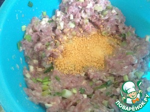 Пшено отварить в подсоленой воде согласно инструкции на упаковке. В фарш натереть лук репчатый на средней терке, чеснок пропустить через пресс. Всыпать специи и мускатный орех. С солью аккуратно, не забываем, что сулугуни достаточно соленый сыр. Фарш тщательно перемешать