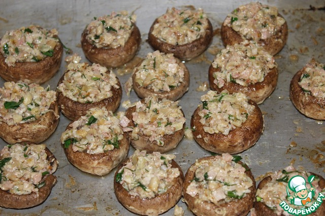 • Шляпки достать из духовки, лишнюю жидкость слить и нафаршировать грибочки начинкой.