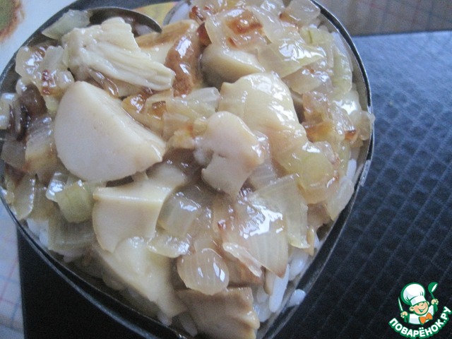 На рис кладем оставшуюся начинку из жареных грибов и лука