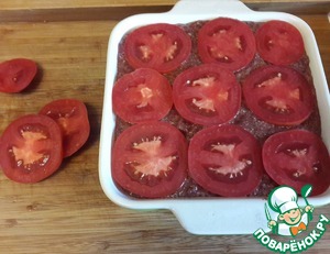 Форму для запекания смажьте маслом и выложите сюда получившуюся массу. Нарежьте кружочками помидоры и выложите сверху. Запекайте в духовке при 170-180 градусах около 30-40 минут