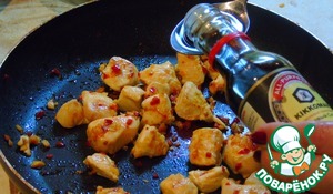 Куриное филе нарежьте кубиками и добавьте в сковороду к имбирю, чесноку чили. Обжаривайте 3 минуты