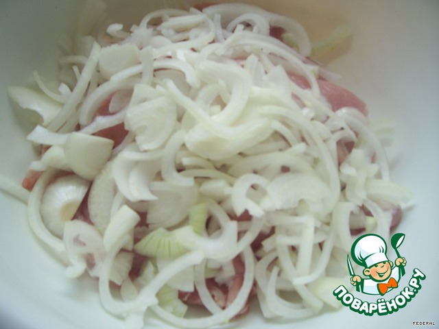 Лук порезать полукольцами, и кольцами, засыпать мясо, залить маринадом и поставить на 2 часа, жарить на грилевой сковороде или гриле.