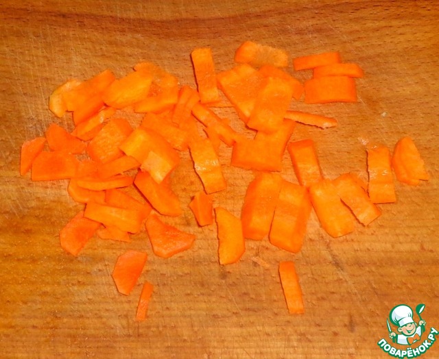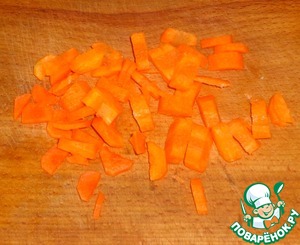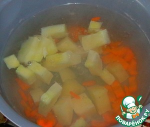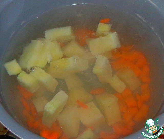 Кабачок порезать небольшими кусочками, у меня кабачок из морозилки. Нагреть мясной бульон и добавить морковь и кабачок. Проварить 5-7 минут.
