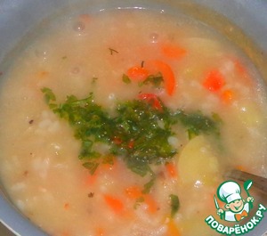 Добавить зелень, соль, перец черный и красный жгучий по вкусу, а также молотый имбирь и лавровый лист. Проварить еще 10 минут на медленном огне.