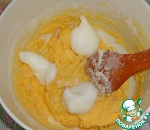Белки соединить со щепоткой соли и взбить в крепкую пену. Добавить белки в тесто.