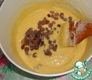 С изюма слить жидкость, обсушить изюм и добавить в тесто. Перемешать.