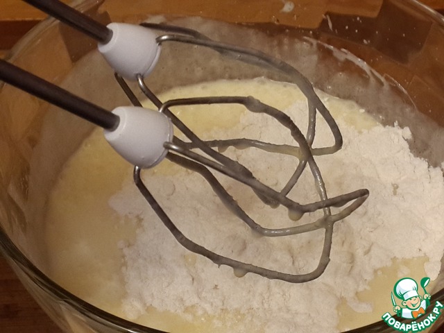 Теперь начинаем вводить муку, смешанную с разрыхлителем. Это можно делать миксером на самых малых оборотах или венчиком. Муку разделите на 4 части и всыпайте в 4 захода. Новую порцию добавляйте только тогда, когда вмешается предыдущая