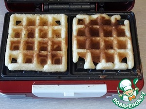 Хорошо разогрейте вафельницу. Для первых вафель я всегда чуть смазываю её маслом, далее смазывание не требуется. Выпекайте вафли до готовности