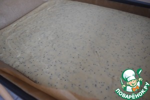 На стандартный противень от духовки (30х40 см), застеленный бумагой для выпечки, выливаем наше тесто и разравниваем. -