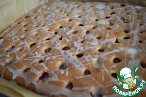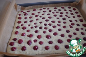 Теперь распределяем вишню, вдавливая ее в тесто. Вот так. И отправляем пирог в духовку на 30-35 минут, до золотисто-коричневого цвета.