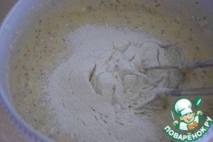 Добавить мягкое сливочное масло, сметану и муку, просеянную через сито с разрыхлителем и солью. Я не могла не добавить штрих от себя. Сметаны немного не хватило и я добавила ложку йогурта с маком. А чтобы мак не выглядел по-сиротски, добавила ещё 1 ст. л. сухого обычного мака. Но, повторюсь, это чисто моя фантазия, а фантазии у нас приветствуются.