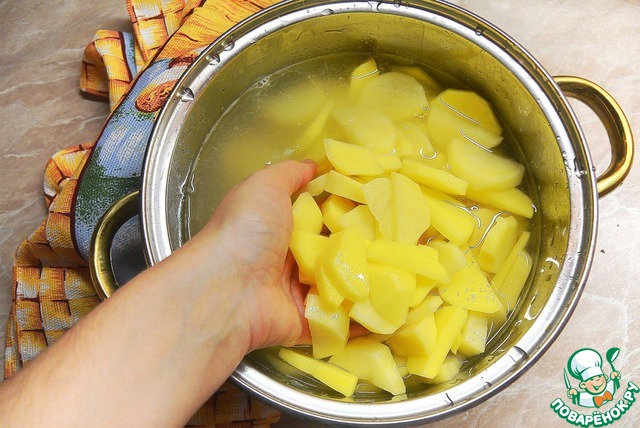 Как сварится картофель - слить воду. Но не выливать ее! Она нам будет нужна.