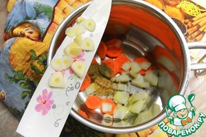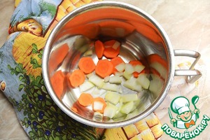 Морковь нарезать кружочками, а лук кубиками. Положить в кастрюлю.