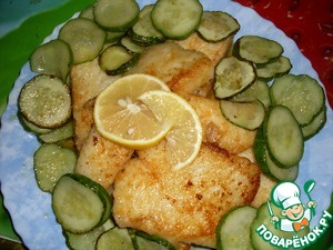 На блюдо выкладываем пожаренную рыбу, обкладываем поджаренными огурцами, по желанию посыпаем зеленью петрушки (мой благоверный не очень любит это дополнение, поэтому я этот шаг пропустила, и без него получилось замечательно), поливаем лимонным соком и оставшимся на сковороде сливочным маслом. И всё. Наслаждаемся! Приятного аппетита!