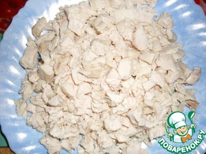 Отваренное куриное филе или другие части отварной курицы нарезаем кусочками