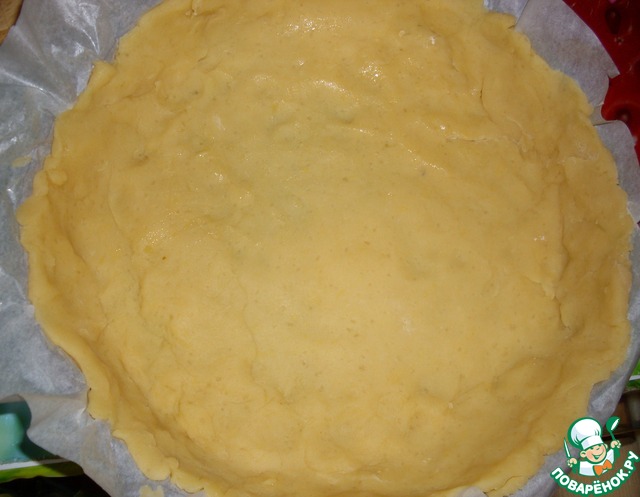 Раскатываем тесто в пласт шириной 0,3 см, кладем в форму для выпечки торта смазанный маслом пергамент так, чтобы он закрывал также боковые стенки, и помещаем на него раскатанное в пласт тесто. Разравниваем по дну и стенкам формы и ставим в холодильник еще на 30 минут