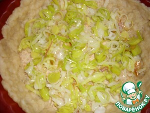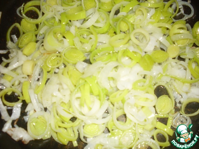 Белую и светло-зеленую части лука-порея тушим в сковороде на растительном масле, пока лук не станет прозрачным