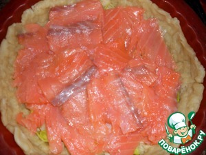 Сверху распределяем нарезанную тонкими кусочками рыбу