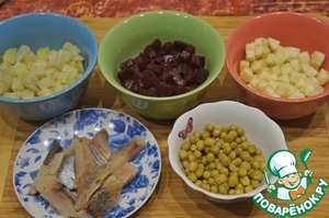 Свеклу и картофель отварить, остудить, очистить и нарезать небольшими кубиками. Яблоко очистить и нарезать такими же кубиками. Свеклу перемешать с небольшим количеством растительного масла. Яблоко слегка сбрызнуть лимонным соком. Селедочку разделать на филе.