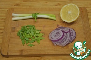 Лук нарезать тонкими кольцами. Зеленый лук мелко нарезать.