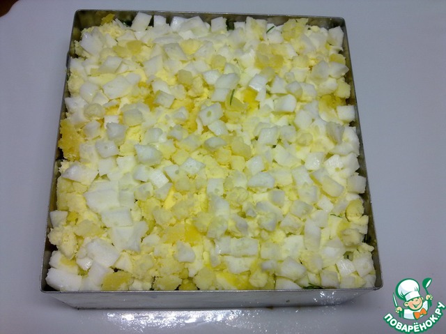 Далее следует слой рыбы (рыбу предварительно разделить вилкой на небольшие кусочки). Его тоже можно слегка полить заправкой.