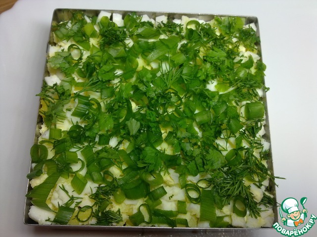 Пока варится крупа, сварить яйца и нарезать зеленый лук. Теперь выкладываем лук на слой из рыбы. На лук выложить мелко нарезанные яйца.