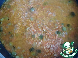 Теперь добавляем промытую чечевицу и кипяченую воду. Чечевица должна быть покрыта водой. Тушим на медленном огне 10 минут. При необходимости добавляем воду.