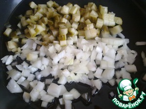 Добавить морковь к луку и огурцу, обжариваем. Овощная смесь должна хорошо прожариться и лишиться воды. Обжариваем ее до тех пор, пока лук не зарумянится.