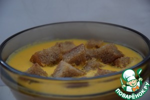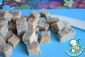 Такой супчик можно подавать с сухариками. Я готовлю их очень просто: нарезаю хлеб на такие квадратики