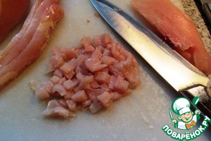 Куриное филе нарезаем мелким кубиком. Очень удобно нарезать чуть подмороженное филе.