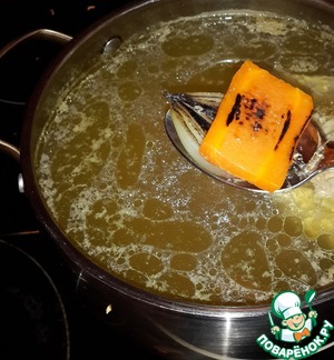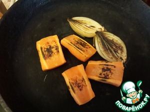 Половину лука и моркови подпеките на сухой чугунной сковороде до черноты и добавьте в бульон. Убавьте огонь и варите бульон при тихом кипении около 2 часов