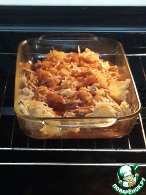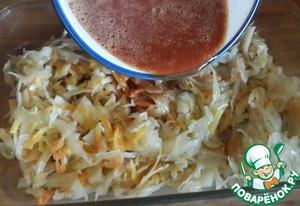 Поместите лоток с капустой в духовку, запекайте около 1,5 часов при температуре 160-170 градусов, периодически помешивая. Если необходимо, можно подливать по несколько ложек бульона из кастрюли.