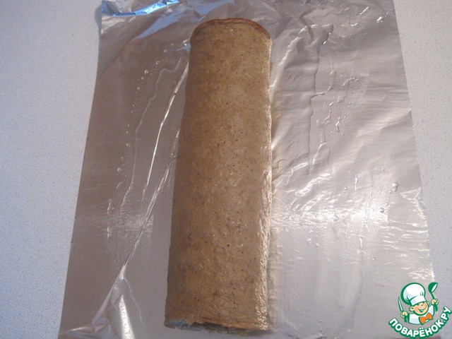Печеночный блин в горячем виде переворачиваем на стол, удаляем фольгу, равномерно размазываем начинку