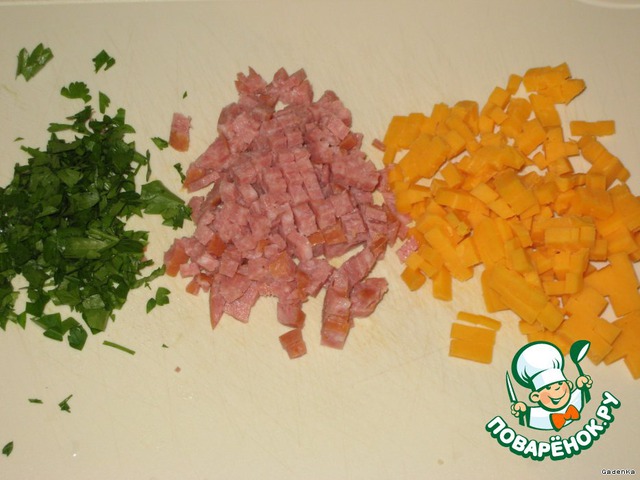 Сыр и колбасу порезать на маленькие кубики, зелень мелко порубить.