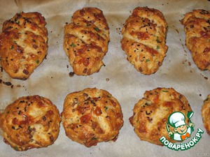 Выложить на противень, смазать разболтанным желтком с молоком, посыпать кунжутом.