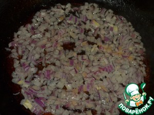 Красный лук очищаем, мелко режем и обжариваем на масле.