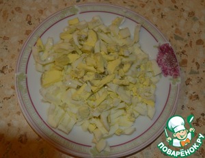 Готовые яйца, очищаем от скорлупы, режем, я воспользовалась яйцерезкой.