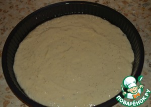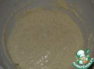 Далее добавляем разрыхлитель и муку, вымешиваем, получается тесто, как на оладьи, консистенция густой сметаны