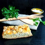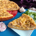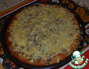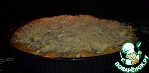 Ставим форму в разогретую до 180 градусов духовку, печётся достаточно быстро, минут 20. Пока пирог в духовке, натираем сыр на мелкой тёрке.