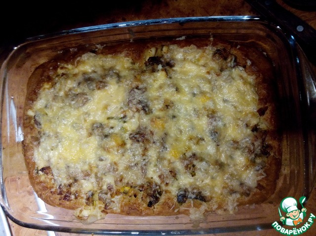 Как только края у пирога начнут румяниться, аккуратно выдвигаем, посыпаем верх сыром и ещё минут на 5, чтобы сыр растаял и чуть зарумянился. Я на это время низ духовки выключаю и зажигаю верх.