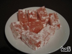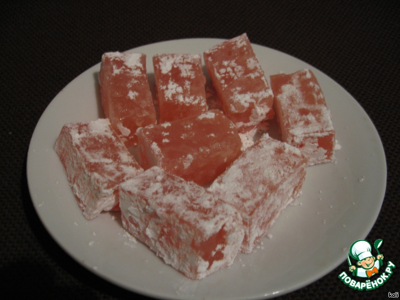 Восточное лакомство из крахмала, лимонного и апельсинового сока, ароматизированное апельсиновой и лимонной цедрой, перечной мятой. На турецком языке "рахат-лукум" означает "отдых для рта", насколько я помню :) Нежные... вкусные... ароматные кубики, посыпанные сахарной пудрой. Моя вариация на тему рахат-лукума... вкус и вид лучше, чем то, что можно купить в магазине.