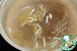 На разогретом растительном масле обжарить нарезаные соломкой чеснок и имбирь.