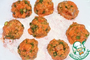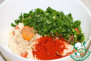 Добавить мелкорубленные укроп и зеленый лук, яичный желток и 1 ч. л. копченой паприки. Прибавить 1 столовую ложку муки, посолить, если понадобится (соевого соуса вполне достаточно), приправить перцем. Тщательно вымешать.