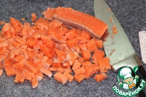 Филе форели промыть, обсушить, порезать мелкими кубиками.