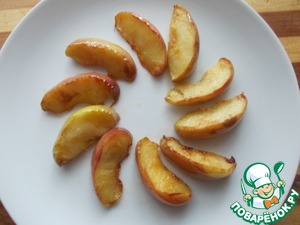 Разогрейте в сковороде масло, обжарьте сразу яблочки с двух сторон, пока не начнет выделятся карамель. Затем в том же масле, на небольшом огне обжарьте печень, но не пересушите, она должна остаться мягкой. Я не солила, мне вполне хватило заправки с соевым соусом.