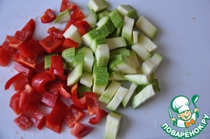 Пока варится рис, берём цуккини и красный болгарский перец и режем кубиками.