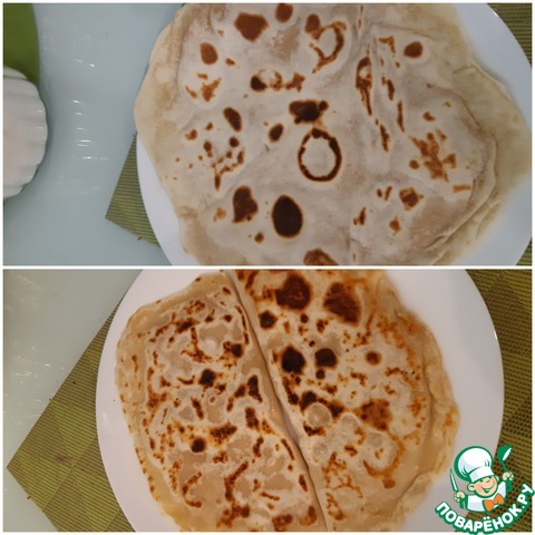 Сверху выложить такую же лепешку, обрезать края. Либо выложить начинку на один край и закрыть другим, в виде "полумесяца". -