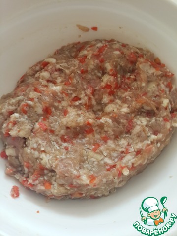 Добавьте в фарш мелко-мелко нарезанный сладкий перец и перец чили. -