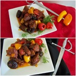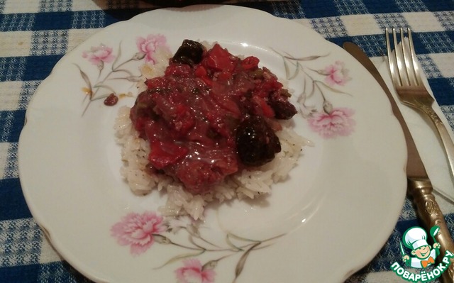 Помидоры режем крупным кубиком, чернослив разрезаем пополам и все это добавляем к мясу. Выкладываем только сейчас все специи.